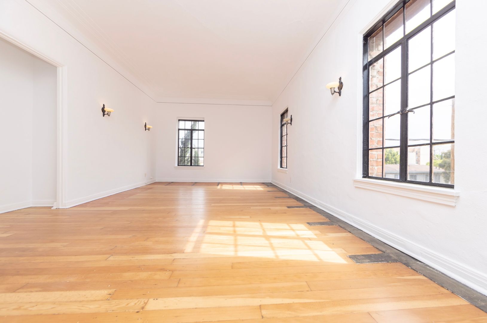 Additional features include high ceilings with elegant crown molding and beautiful French windows. In the kitchen and dining area, a concrete accent wall paired with vintage built-in cabinets creates a warm, stylish, and subtly modern atmosphere.