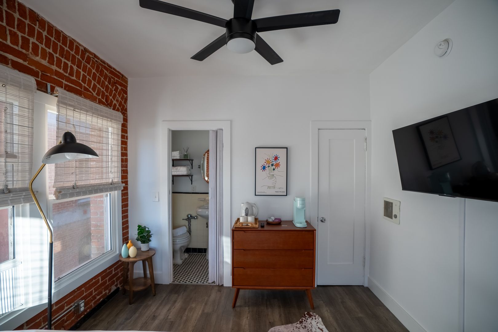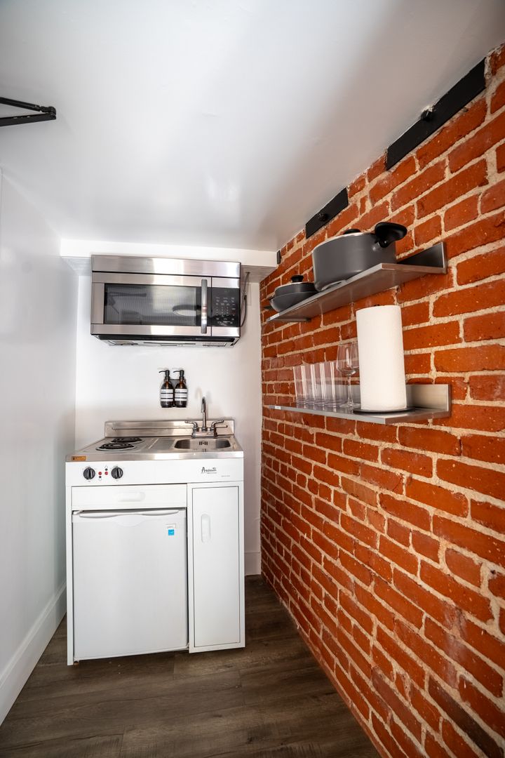 This thoughtfully designed bachelor unit offers both comfort and privacy, featuring a full-size bed with quality bedding and a bright corner layout that brings in natural light. The kitchenette includes all the essentials for preparing light meals and snacks, while the clean, functional bathroom provides everything you need for a comfortable stay. Enjoy relaxing evenings with the in-unit TV, and take advantage of convenient building amenities such as an on-site laundry room, dedicated management support, and an on-site representative for a smooth and worry-free experience. This unit has a floor area of approximately 275 sq ft.